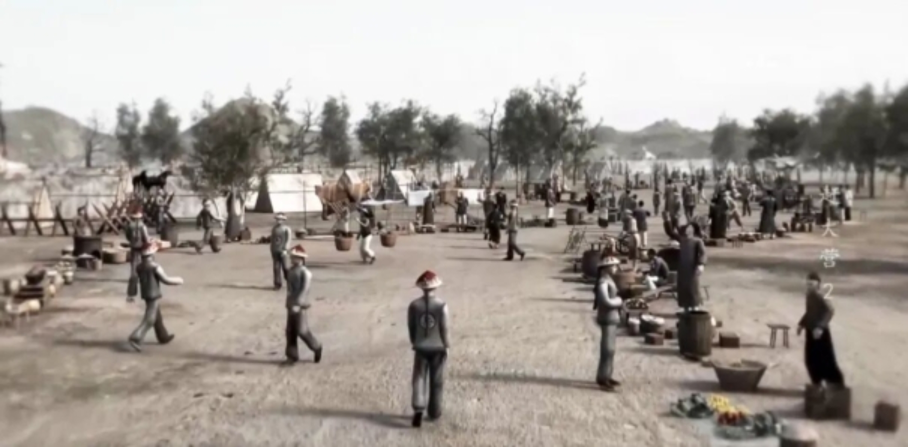▲“大营客”随军经商的场景再现。(图片来源:纪录片《赶大营》)